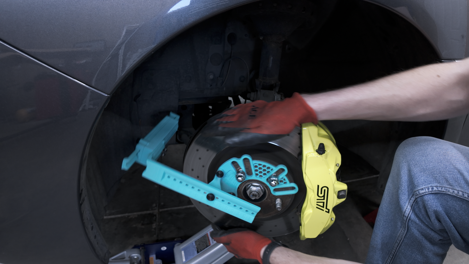 Attach the appropriate hub plate for your vehicle (4-lug, 5-lug, 6-lug, or 8-lug). Adjust the tool to the correct diameter, width, and offset.