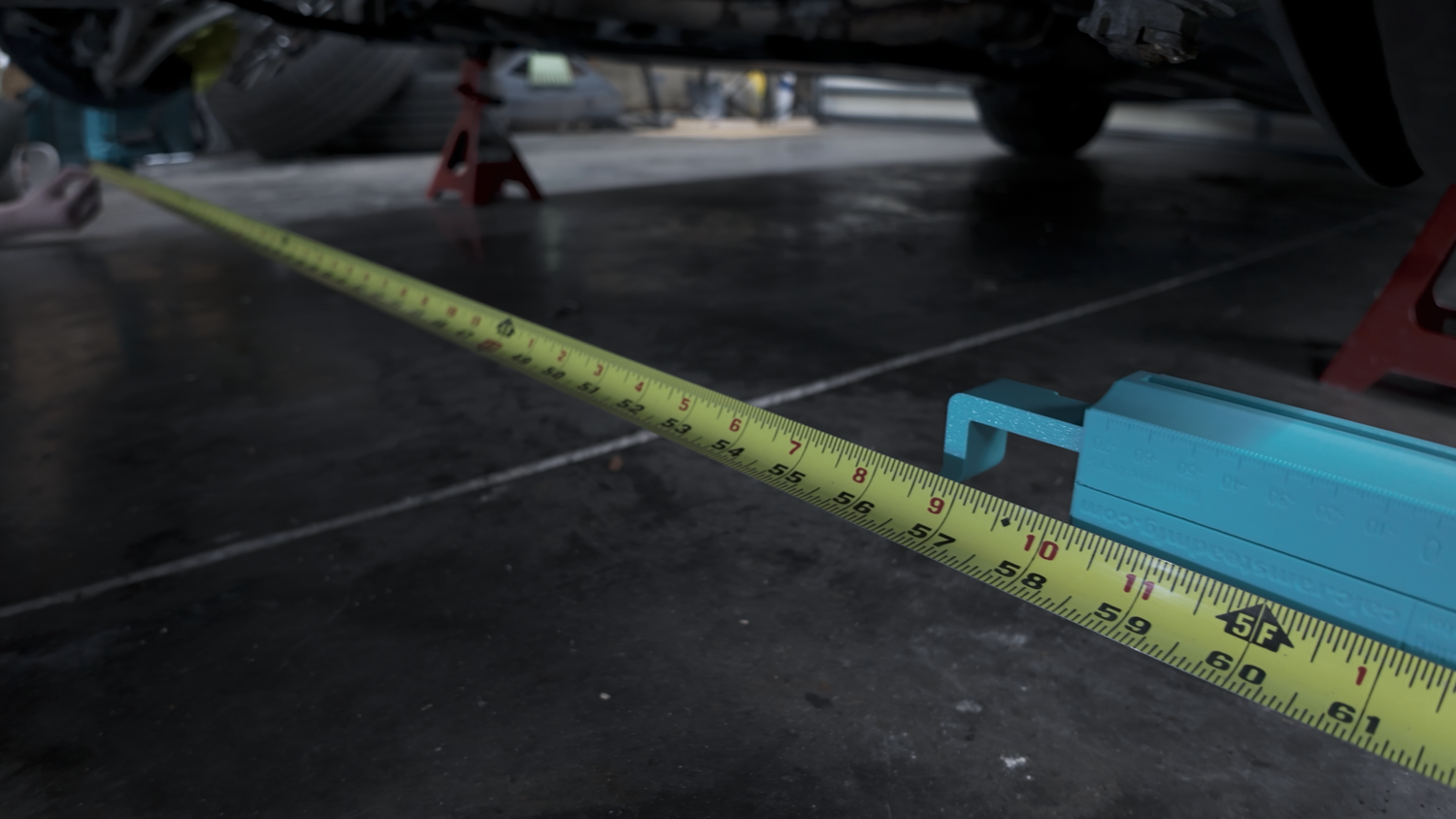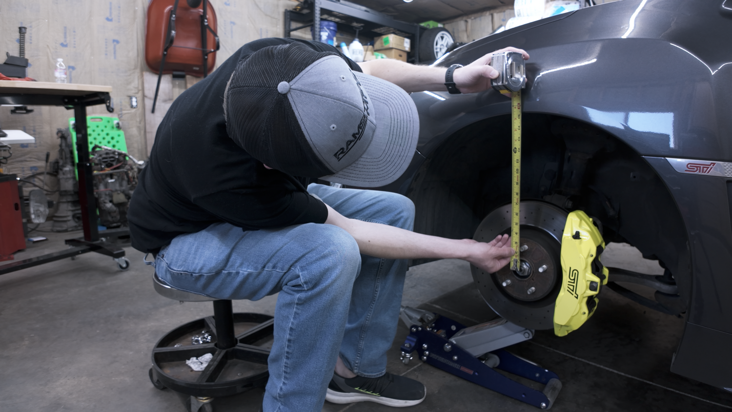 Start by measuring your ride height with the vehicle on the ground. You'll want to match this height when using the tool because your hub position and alignment will not be correct if you let the suspension hang in the air. The best way to do this is by measuring from the center of the hub to the fender while the car is on the ground.